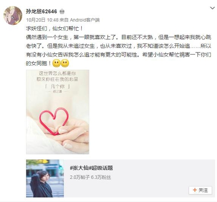 不过,除了这些,张大仙日常生活中也为网友排忧解难。这位网友,是张大仙的粉丝,网上询问网友如何追一个自己一见钟情却不太熟的女神。