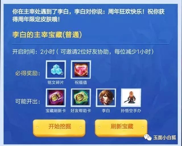 3、峡谷寻宝开启9天,每天平均至少获得17点祝福值才能兑换游园惊梦,每天挖掘四个传说宝藏即可;