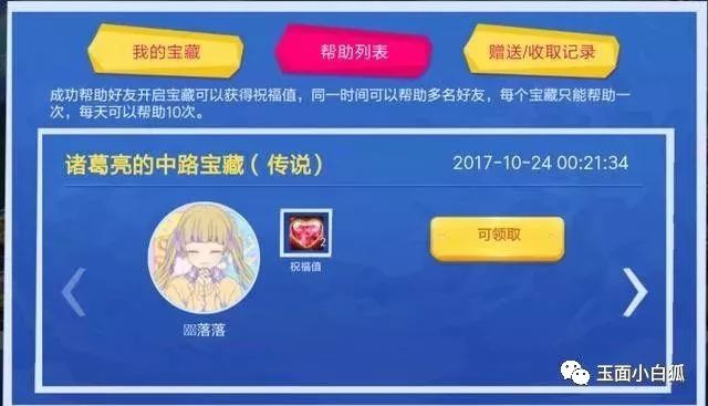 还有些玩家,帮助了别人,却没有得到祝福值,其实帮助别人挖宝的祝福值,需要自己去领取。点开活动页面,再点击我的宝藏,接着点击帮助列表,最后领取祝福值即可。