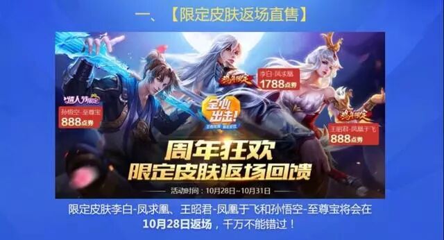 这个是根据玩家之前的投票,最后由李白-凤求凰、王昭君-凤凰于飞、孙悟空-至尊宝生出,将在周六开启返场,只有3天!各位错过这次再等半年!