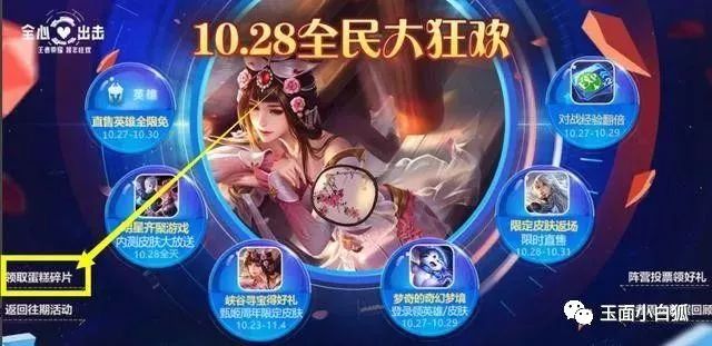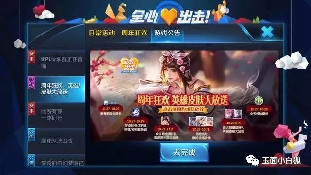 活动地点:游戏内——活动——游戏公告——【周年狂欢,英雄/皮肤大放送】——去完成——领取蛋糕碎片