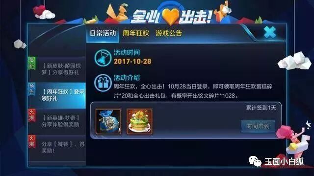 2、10月28日签到领取蛋糕碎片*20+全心出击礼包一个,全心出击礼包有机会开出1028铭文碎片,这个概率虽然不大,但是也并非极小,初步预测概率在1%~10%之间吧。