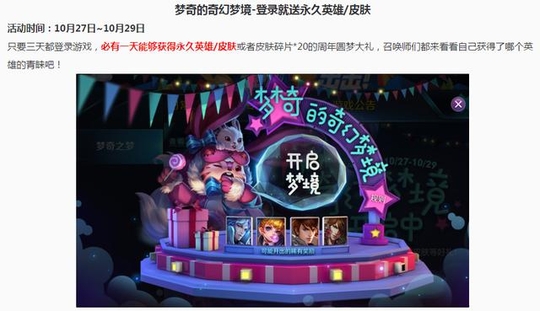 10月27日~10月29日,只要三天都登陆游戏,必有一天能够获得永久英雄/皮肤或者英雄碎片*20的周年圆梦大礼。