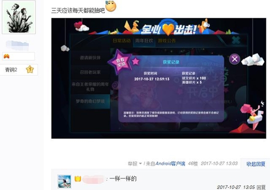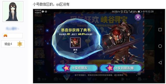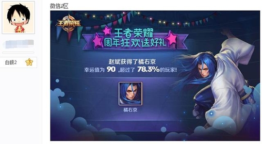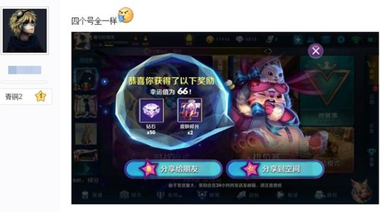 其实,抽到的东西……也不咋地嘛,说是能抽到永久皮肤,但是目前看到的网友大多都是抽到了英雄,惨一点的就是钻石和皮肤碎片。抽到SNK英雄也才算超越78.3%的玩家,不知道那剩下的21.7%的玩家要抽到什么哦。话说微信2区都开了,小编玩的微信11区还没动静……