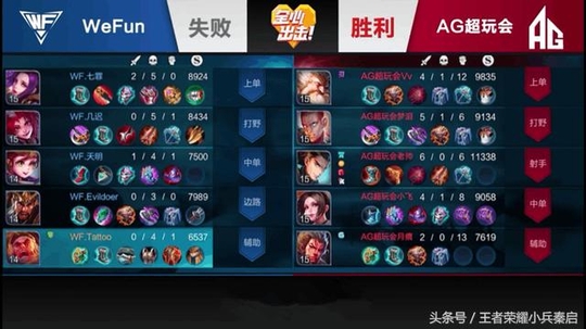 由于经济的差距以及打法的变革,AG稳健的逼近,而WF一步步退守防区,最后,这一场比赛由AG超玩会取得胜利,从上图的赛后结算来看。这次是大比分的胜利,AG这边老帅是当之无愧的MVP,而WF则是七罪使用的芈月获得最佳。