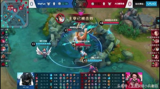 在第一波团战胜利之后,AG超玩会稳扎稳打,各自带线,以最快的速度发育,继续保持经济领先。