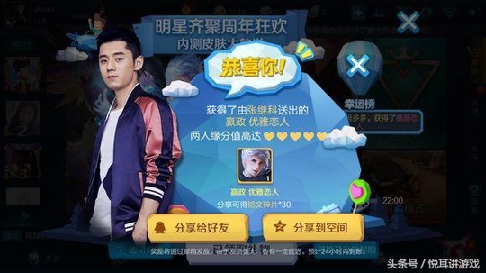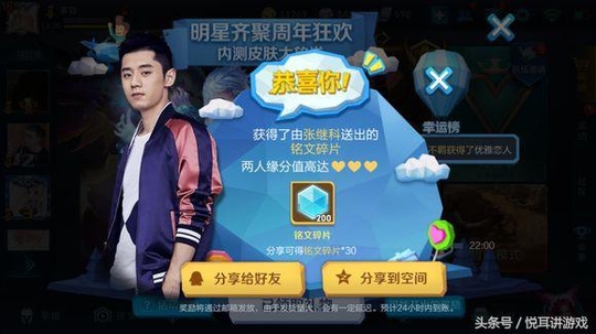 我们先来看下,这些比较正常的玩家的奖励,200铭文碎片,而悦耳只有150,可能因为明星是男的不来电吧。不过这只是开胃菜而已,我们继续看其他玩家的奖励。