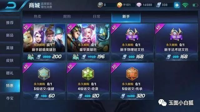 首先这个新手礼包和正式服的新手超值礼包不一样,正式服的新手超值礼包包含了狄仁杰、小乔和墨子,而这个礼包却是狄仁杰、曹操、王昭君,这几个英雄的廉价皮肤也组成了一个新手皮肤礼包,天美估计是想替换掉正式服的新手礼包吧。PS:下图有BUG,2000点券新手超值英雄包3折只卖200点券,1960点券豪华英雄包5折只卖196点券,只可惜该有的都有了。