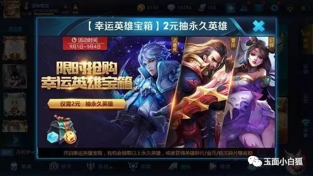 2元幸运英雄礼包:英雄碎片*2,有机会获得诸葛亮或孙悟空;