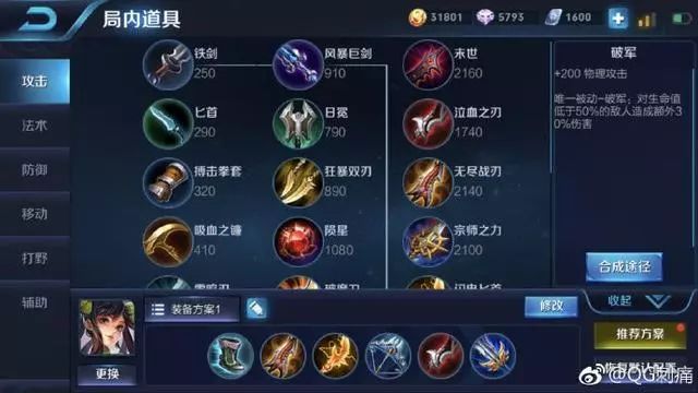 这一套是刺痛给的出装,职业选手总是这样留一手。(告诉大家正确的出装)
