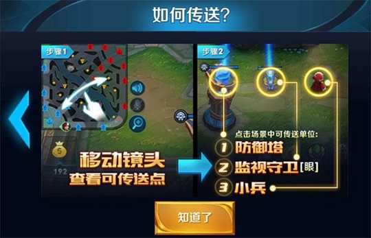120秒CD:吟唱3秒后,将英雄传送到友方机关、小兵或守卫(迷雾模式)身边。