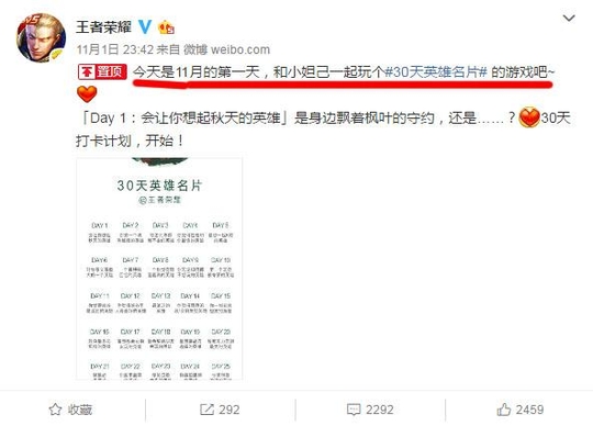 王者荣耀官博小妲己是很喜欢和玩家互动的。在11月1号,也就是前天,王者荣耀官方微博发布了一份独特的日历。