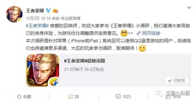 11月3日当天,王者荣耀官博就针对ios系统,进行了一次调研,此次调研只针对QQ苹果用户,竟然没想到,这居然是ios体验服资格申请的第一步。