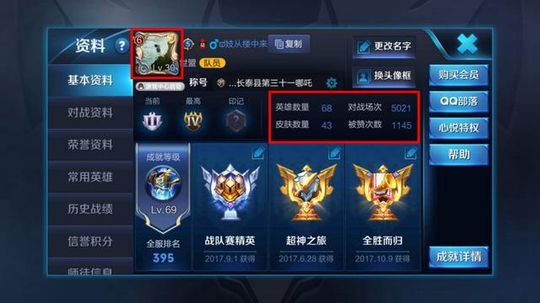 这是使用成吉思汗的那为玩家,亮出了自己面板数据贵族V6,68个英雄,43个皮肤,虽然不多但是也还算是小康了