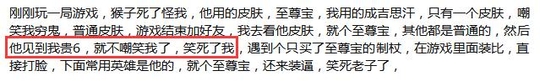 这两位玩家因为一些英雄出装的不和,产生了一些口角,猴子因为穿着至尊宝的皮肤就开始嘲讽成吉思汗:一个破皮肤,穷鬼!然而使用成吉思汗的这位玩家也是报批脾气直接回怼:比皮肤?我没有至尊宝?