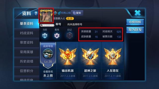 没有贵族标记的等级,最高也只是打到了钻石五,31个英雄,16个皮肤