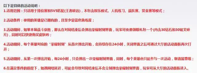 最后是活动的注意事项,必须是蓝色熟练度。大家想要哪个英雄的皮肤一定要想好!每24小时,只会弹出一次荣耀时刻的界面,而每个英雄也只能参与一次活动。