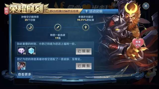 荣耀时刻,是你玩匹配、排位的胜利的时候会弹出下图!他的重点在于可以“快捷购买皮肤”