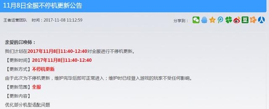 11月8日下午11:40到12:40对全服进行不停机更新。更新内容为优化部分机型适配问题。