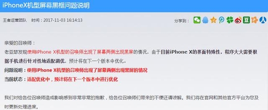 很明显,这就是针对iPhone X有黑边问题的优化。因为王者荣耀作为一款已经发布两年的手游,市面上大部分配置足够的机型,肯定是能够流畅运行的。唯独刚发布的iPhone X,在适配上还存在一些问题。这个问题,在iPhone X刚发布时,王者荣耀一方就已经在进行优化,并早早的发布了公告。