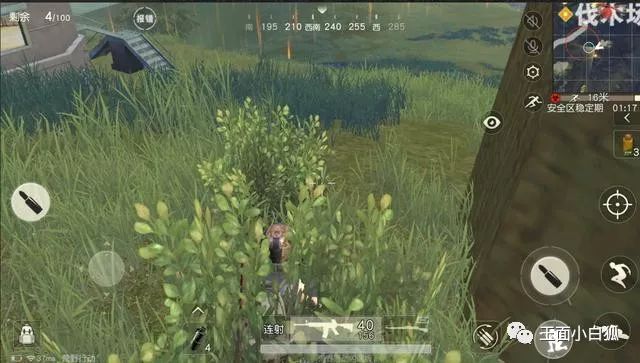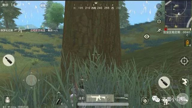 不管是伏地魔还是正面刚,都是推荐大家躲在掩体后面打,就算自己挨枪子了,也可以躲在掩体后面加满血再去对枪。掩体肯定是越大越好,城市里找围墙,野外找大树或石头,躲在掩体后面在四处找猎物,时刻注意自己背后有没有来人。