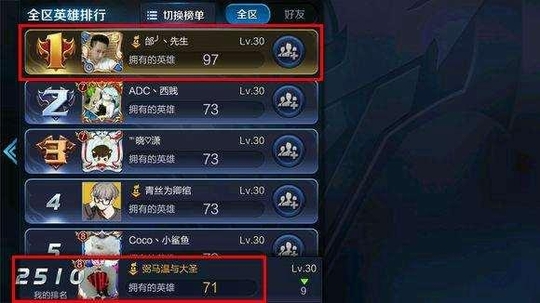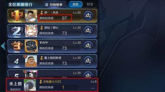 这是安卓手q14区的英雄数量排行榜(全区排行),小六当时看到楞了一下,这个第一名比第二三名怎么多了那么多?还有啥时候有97个英雄了啊!