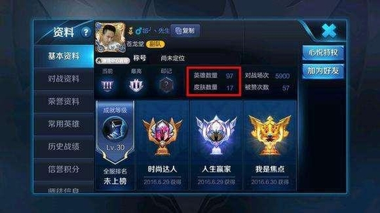 排行第一的那位玩家的个人基本资料图,从图上我们可以看到,英雄数量确确实实是97个