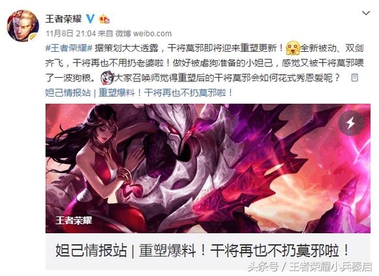 在八号的时候,官博已经放出爆料,新版的干将已经重做完成,但是为什么没有上线呢?新版本的干将每个技能都重新设计,其中大招不再丢老婆了,这个梗也将成为历史。