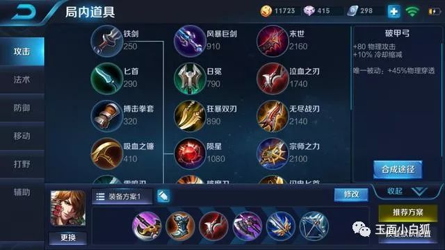 装备2:追击刀锋+攻速鞋+泣血之刃+暗影战斧+破军+破甲弓