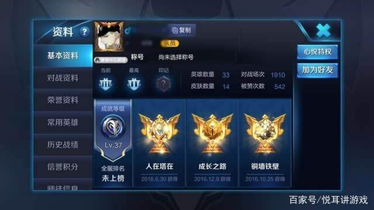 我们来看下这个300元买的账号,一共1910场次,最高铂金2,目前是铂金3段位,皮肤只有14个,英雄只有33个,不过如果只是为了单纯的开黑撩妹的话,这也够用了。