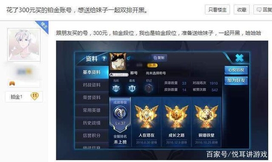这位玩家称自己花了300元跟自己朋友买了一个铂金的账号,准备送给妹子一起开黑,然后在游戏中跟妹子培养感情,然后组CP,然后。。。。恩,其他的你们自己脑补。因为他自己也是铂金段位,所以买个铂金的刚好一起组。悦耳估计这是所有男人的梦想,能跟自己喜欢的人一起开黑,然后喂其他队友吃狗粮。