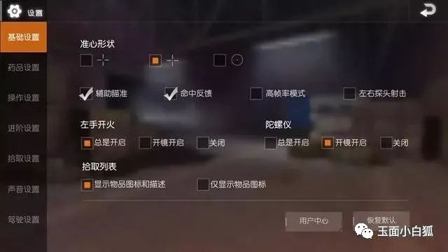准心设置无非就是外观不同,不过有些玩家喜欢圆圆的准心,这个因人而异,看自己的爱好。另外一个陀螺仪设置,大部分手机都支持,意思就是手机向两边倾斜的时候,准心也会随着手机倾斜度而发生相反的移动,这种瞄准适合狙击枪的甩狙,但也不建议大家关闭,可以在开镜的时候微调准星。