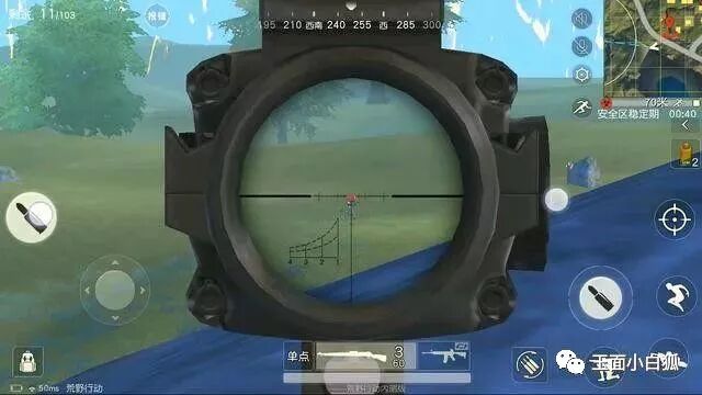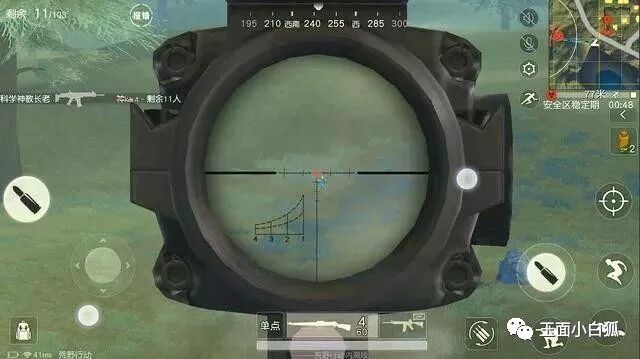 高倍镜:先将不开镜的准星对准目标大概位置,然后打开高倍镜瞄准,右手缓慢瞄准或陀螺仪微调,瞄准后左手点击射击。开高倍镜的时候,一定要注意周围是否安全,紧贴障碍物或者草丛半蹲,打完立刻趴下,防止声音出卖位置而被周围的敌人看到。