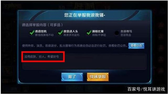 没有皮肤,穷人,希望封号。呵呵呵呵,这理由如果天美看到,都表示一脸懵逼。现在游戏中花点小钱的玩家都这么任性了吗?只需5000就能达到贵族8,不知道的人还以为得5万50万呢。每个人观点不同,对待游戏的态度也不同,你们认为花钱能买来开心,我们没意见,甚至是支持,毕竟开心了就好,而我们不花钱,把游戏只当成消遣时间的方式,为什么就招你们不待见了?悦耳不太懂,谁懂告诉下悦耳吧。
