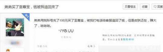 玩家称弟弟用他的账号充值了198元买了至尊宝,自己发现后第一时间打了可电话,把钱要了回来,但是令人懵逼的是,钱是退了,但是皮肤还在,这是什么情况?