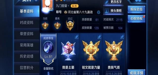 大家可以看到这位玩家有61个英雄,129款皮肤。在2016年就达成了我是土豪的成就,贵族积分达到24万。