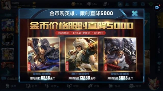 王者荣耀:11.14日更新,3位英雄直降5000金币!MVP算法优化!