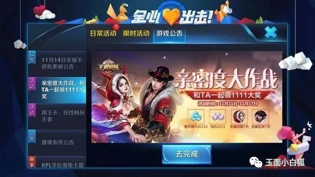 这里还有一个前几天更新的活动,可能有些玩家还不知道,小白狐也是刚刚才看到,顺便就给大家发一下,同样是在游戏公告中进入。这个活动主要是通过一起排位、一起匹配、互送金币、使用CP英雄增加绑定好友的亲密度,可以重复完成任务,当亲密度达到100的时候,就可以领取1111铭文碎片了。