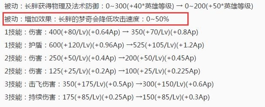 一、二、三技能所有伤害都下调,护盾也有所削弱。只有等到游戏后期,才能和没削弱的梦奇有的一比。此外,被动还增加了一个长胖的梦奇会降低攻击速度的机制。这等于是说官方直接BAN掉了AD梦奇。