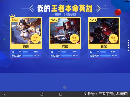 本命英雄是露娜、韩信、白起。