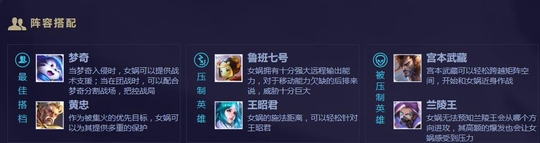 阵容搭配,最佳搭档梦奇、黄忠。克制英雄,鲁班七号,王昭君。女娲的1技能有击退效果,可以打断王昭君的大招。女娲远程输出能力,对于没有移位的小鲁班来说无疑是最大的威胁。