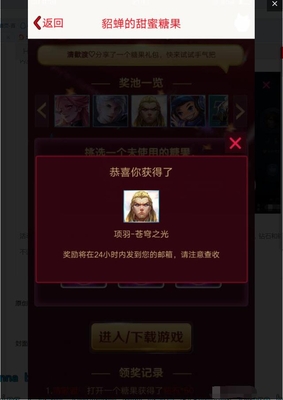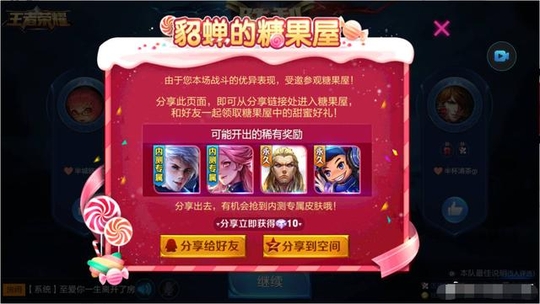 昨天官方上线了新活动,貂蝉的糖果屋。活动时间11.16日到11.20日。对战胜利后可分享弹出的(糖果屋),有几率开出内测专属皮肤,和项羽苍穹之光、鲁班电玩小子2888点券皮肤。