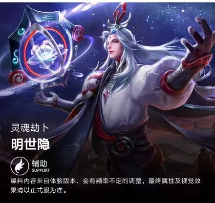王者荣耀新英雄上线英雄情报站了。明世隐,之前传闻是坦克,体验版定位为辅助,而且是有史以来最帅的辅助!