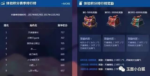 王者荣耀体验服其实和正式服很类似,也有一个赛季更新,不过这个赛季更新纯属是发福利。之前因为体验服没有赛季制度,也没有奖励积分和体验服币,所以活跃量很低很低,几乎一个月不到就要发号一次。如今体验服引入赛季,并以电玩小子、天魔缭乱体验卡、五级铭文做奖励,活跃量大幅上升,现在是两个月发号一次。PS:排行榜的奖励会在15个工作日内发送到已绑定正式服的账号中。