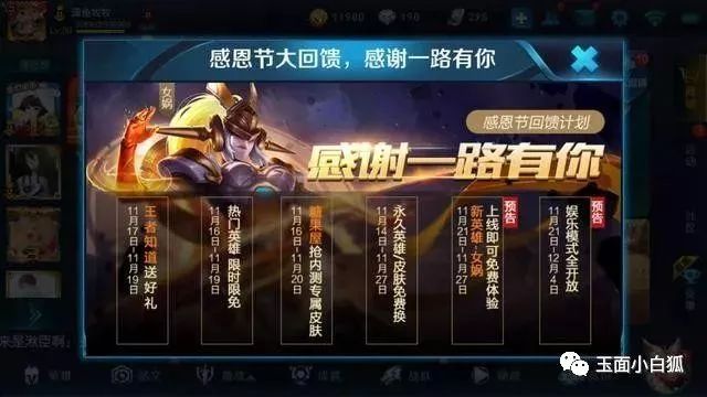 王者荣耀游戏内已经推送了一份感恩节回馈计划,不仅有糖果屋,还有永久SNK三位英雄兑换。而在今日也开启了王者知道答题活动,下周将开启女娲限免活动,新英雄女娲一上线就限免,签到7天更是赠送30天体验卡,不仅如此,女娲首周还降价5000金币,只卖8888金币。另外,下周会开启全部娱乐模式:克隆模式、无限乱斗、火焰山大战。