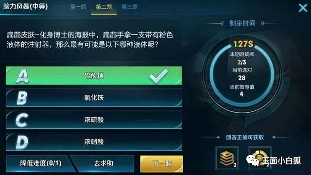 不过下面这题是真的难,化身博士手中的粉色液体是什么?为了这个题目还去查了一下,硫酸镁也并非是粉色的,哪个学霸大神可以解惑???