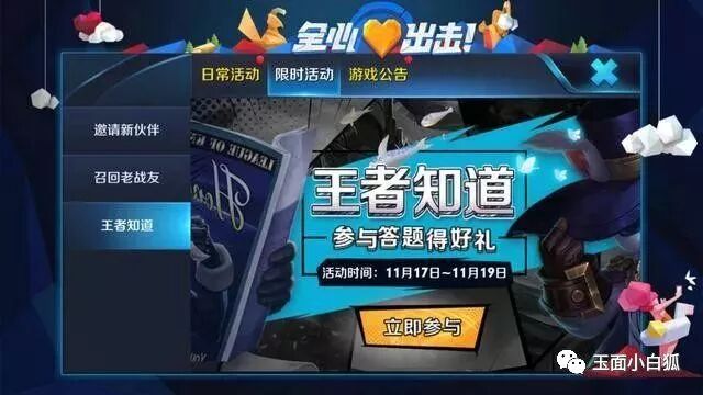 虽然王者知道活动已开启,但是官方没有推送具体海报,大家可以从游戏中——活动——限时活动——王者知道进入。