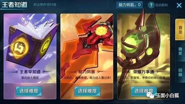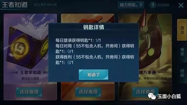 王者知道活动每开启一个题目库,就需要一把脑力钥匙,脑力钥匙需要实战获得:每日登录(一把)+每日实战(一把)+每日首胜(一把),即可获得三把脑力钥匙,两天就可以把全部的题目答完。