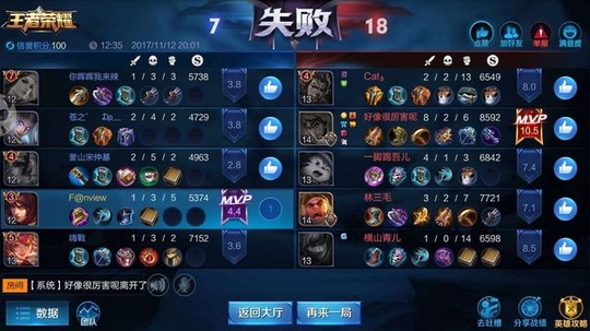 露娜一到线上抓人,对面5人就群涌而上,支援配合非常到位。虞姬一个人在下路对抗张飞,虽然手长,但张飞太肉,一出防御塔就死。