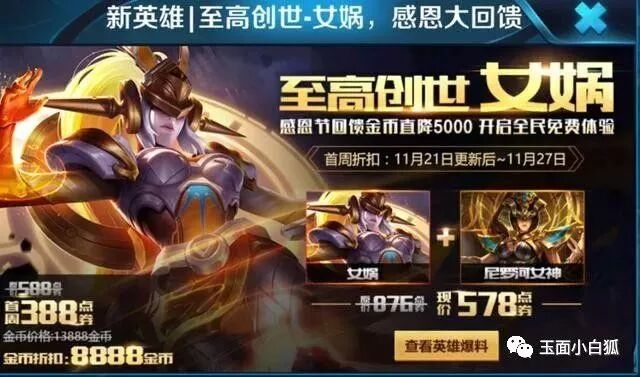 王者荣耀已经发布了女娲售价相关海报,首周售价8888金币,这也是首个降价出售的新英雄。而这还是一个四技能英雄,女娲上线纯属是一个福利活动,最重要是首周进入限免,累计七天登录送30天女娲体验卡,就算不购买女娲,也可以免费体验37天,绝对是惊喜。